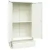 Tủ sắt sơn tĩnh điện, 2 khoang, cánh mở, mỗi khoang có 1 đợt và 1 suốt treo quần áo.Khoang bên trái có ngăn kéo. Khoang bên phải có hộc phụ. Sơn kem